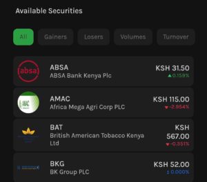 Step 2: Select the Company You Want to Invest In Browse the list of available NSE-listed companies or use the search function to find a specific stock. You’ll see companies like Safaricom (SCOM), Equity Group (EQTY), KCB Group (KCB), East African Breweries (EABL), KenGen (KEGN), and many more.